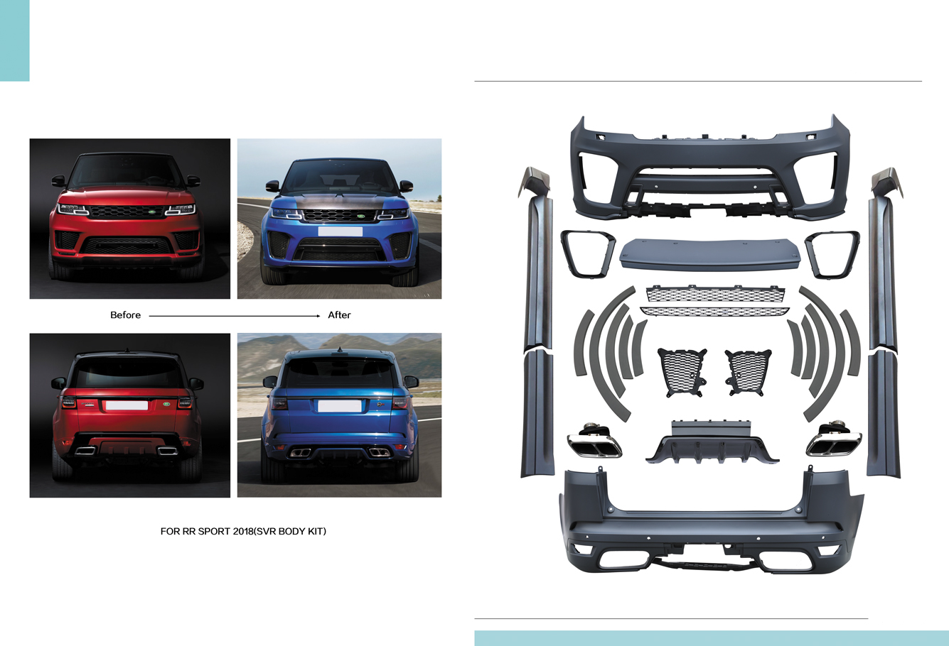 Рестайл комплект SVR restyle Range Rover Sport 2018 – обвес от известного тюнинг-ателье SVR. Предназначен для тюнинга авто с 2013 года. Обвес от SVR для Range Rover Sport не даст вашему автомобилю устареть. Комплект выполнен 1:1 с оригиналом из качественных композитных материалов и пластика. На сайте представлены комплекты для следующих моделей:
